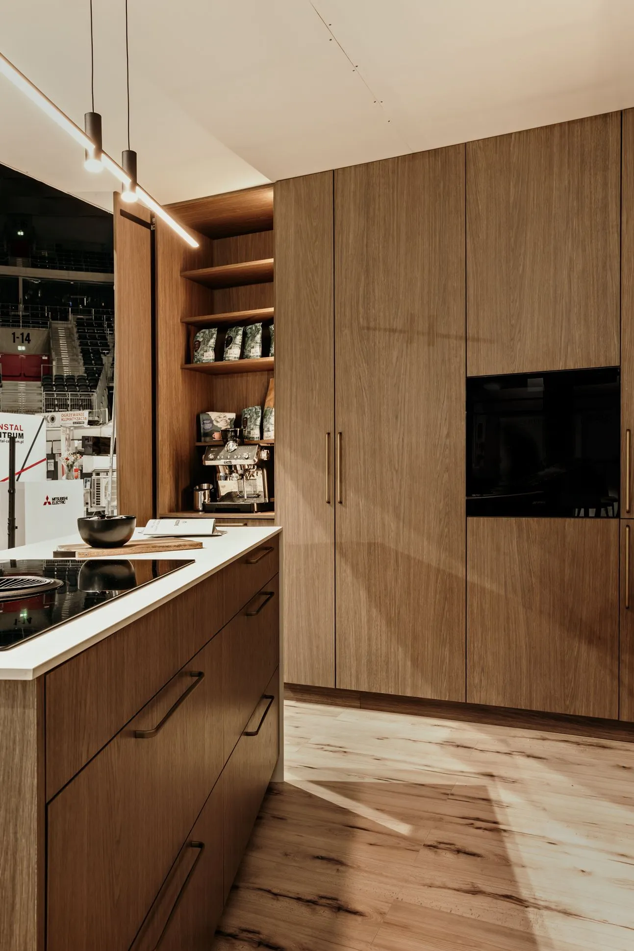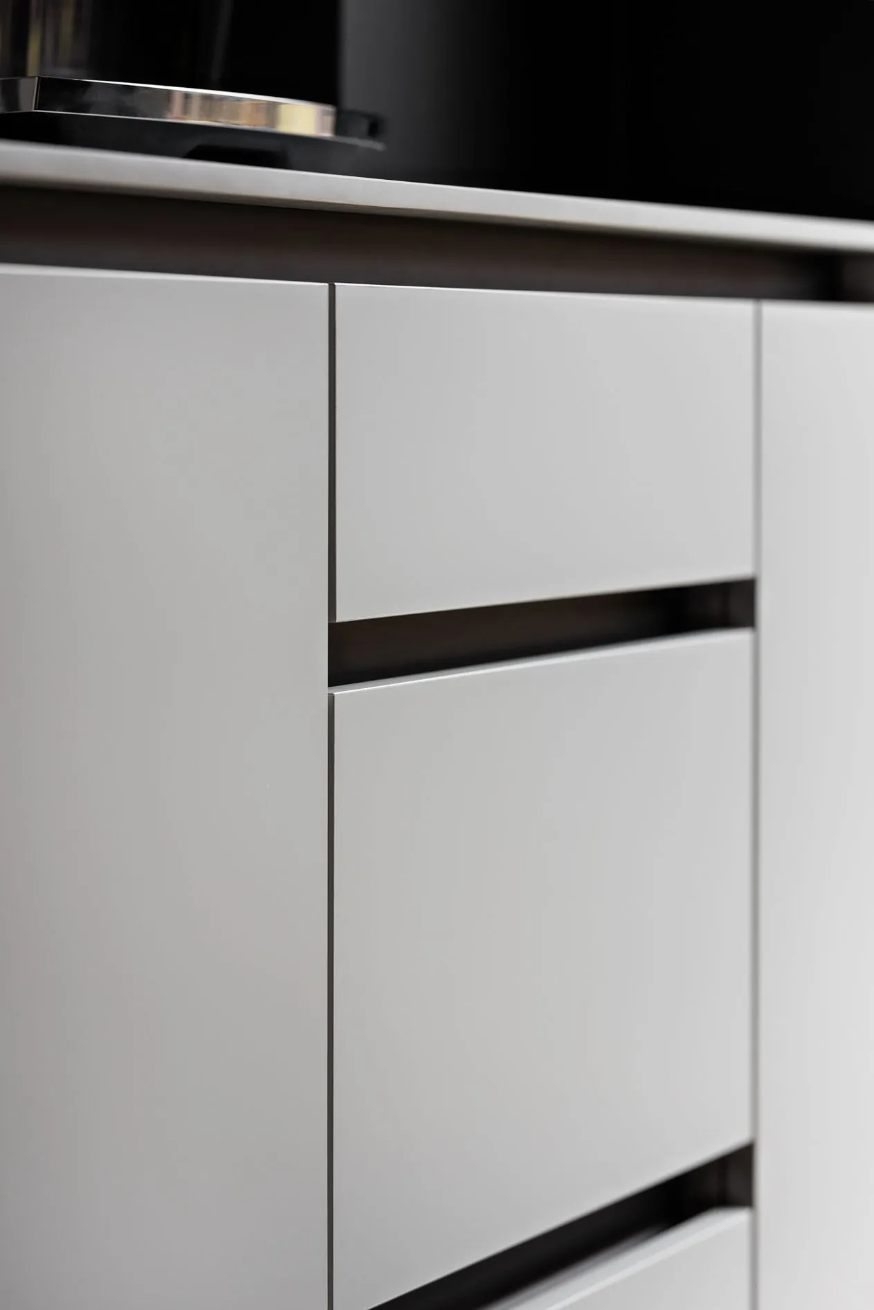 W kuchni uchwyt pracuje intensywnie. Szafki otwieramy wiele razy dziennie, często mając mokre lub brudne ręce. Dlatego bardzo ważne, by uchwyty były wygodne, trwałe i łatwe w czyszczeniu. W naszych projektach najczęściej wykorzystujemy klasyczne uchwyty przykręcane do frontu lub listwy uchwytowe, które są minimalistycznym, ale wciąż bardzo wygodnym rozwiązaniem. W kuchniach zdecydowanie nie polecamy uchwytów frezowanych krawędziowych – trudno utrzymać je w czystości – wszelki kurz, okruszki, woda zbierają się w nich, nierzadko narażając front na szybsze zużycie.