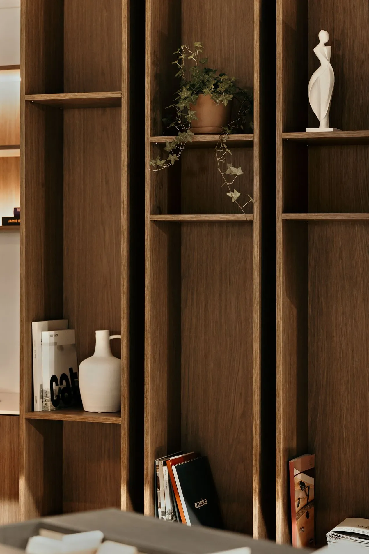 Zabudowy wykonaliśmy z płyty laminowanej ze strukturą drewna, która stworzyła piękny, naturalny efekt, który bardzo Wam się spodobał. Co ważne, nie ograniczyliśmy się tylko do zastosowania jej na frontach – z tego samego materiału wykonane zostały także korpusy i półki, co pozwoliło uzyskać spójny, przemyślany i estetyczny efekt całości.